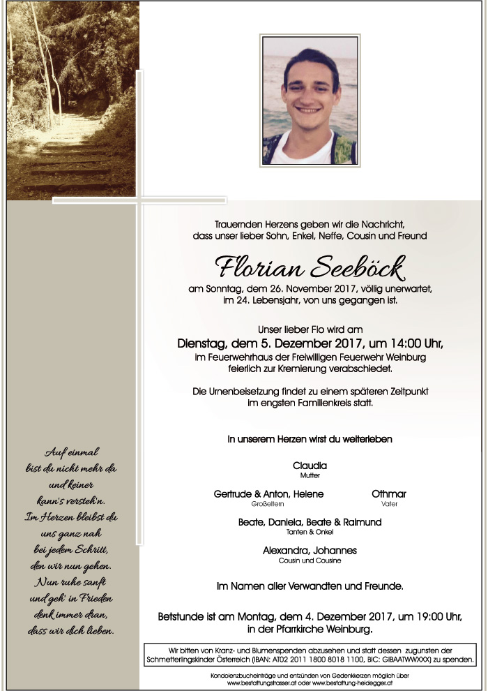 Möge der Schmerz über den schweren Verlust Euch nicht erdrücken und die Erinnerung an die gemeinsame Zeit mit Florian Euch genügend Kraft für die Zukunft geben.