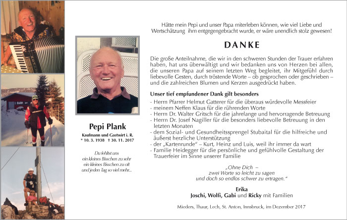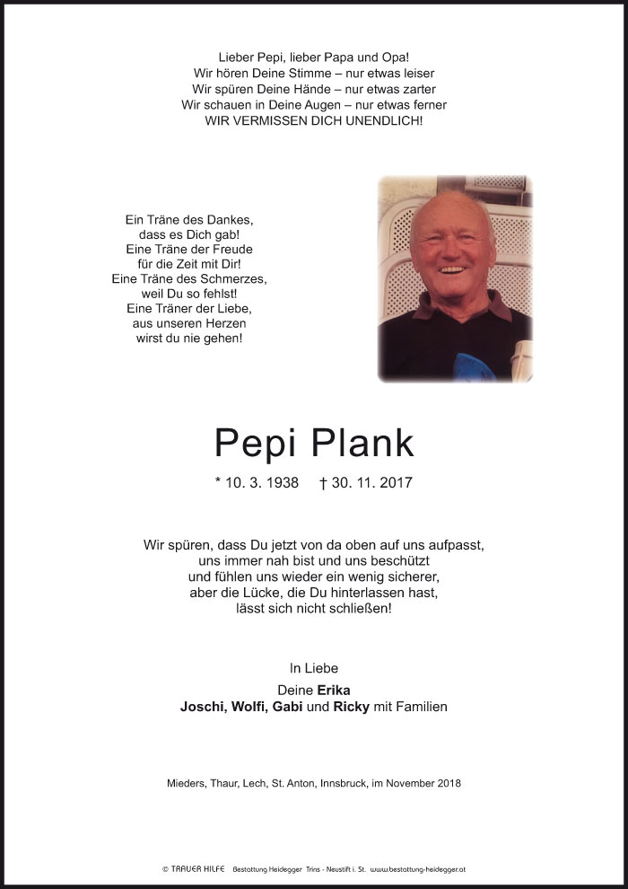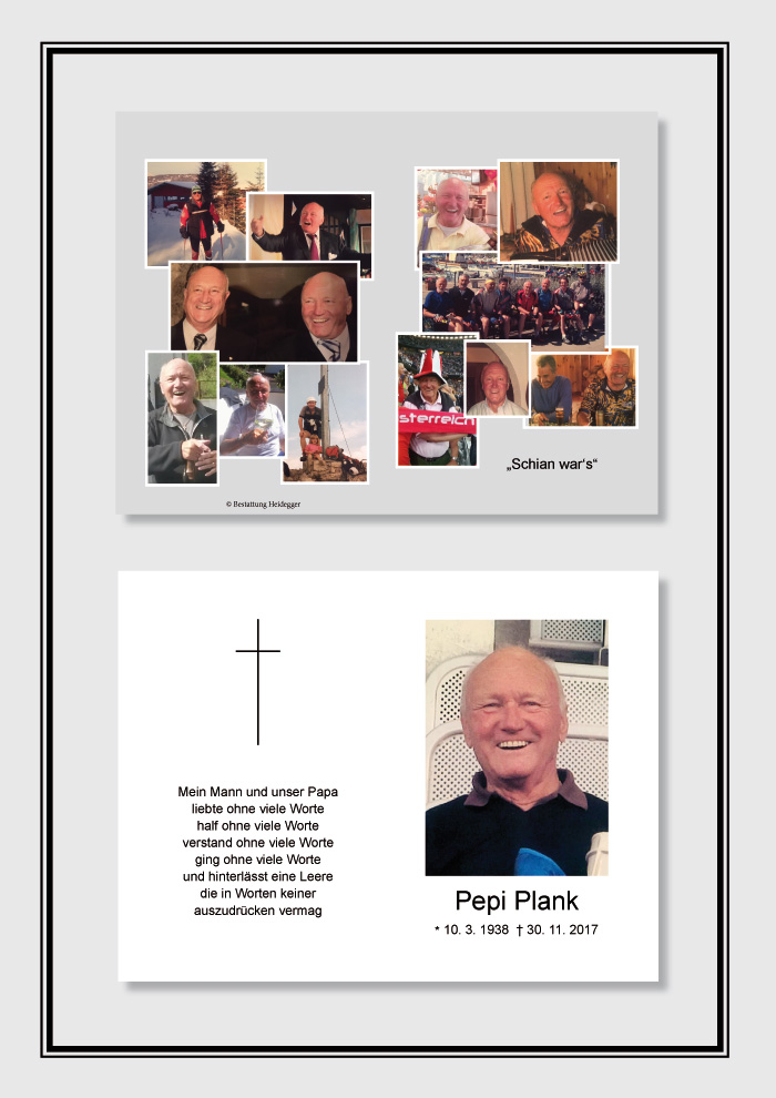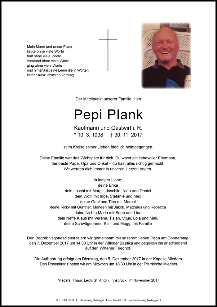 Bestattung wurde durchgeführt von: Karl Neurauter Karl Neurauter Bestattung Heidegger Brennerstraße 69 6150 - Steinach am Brenner Tel.: 05275 5211 zum Bestatter