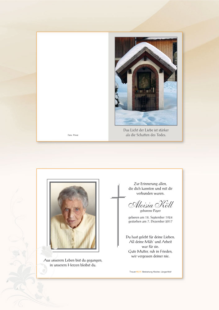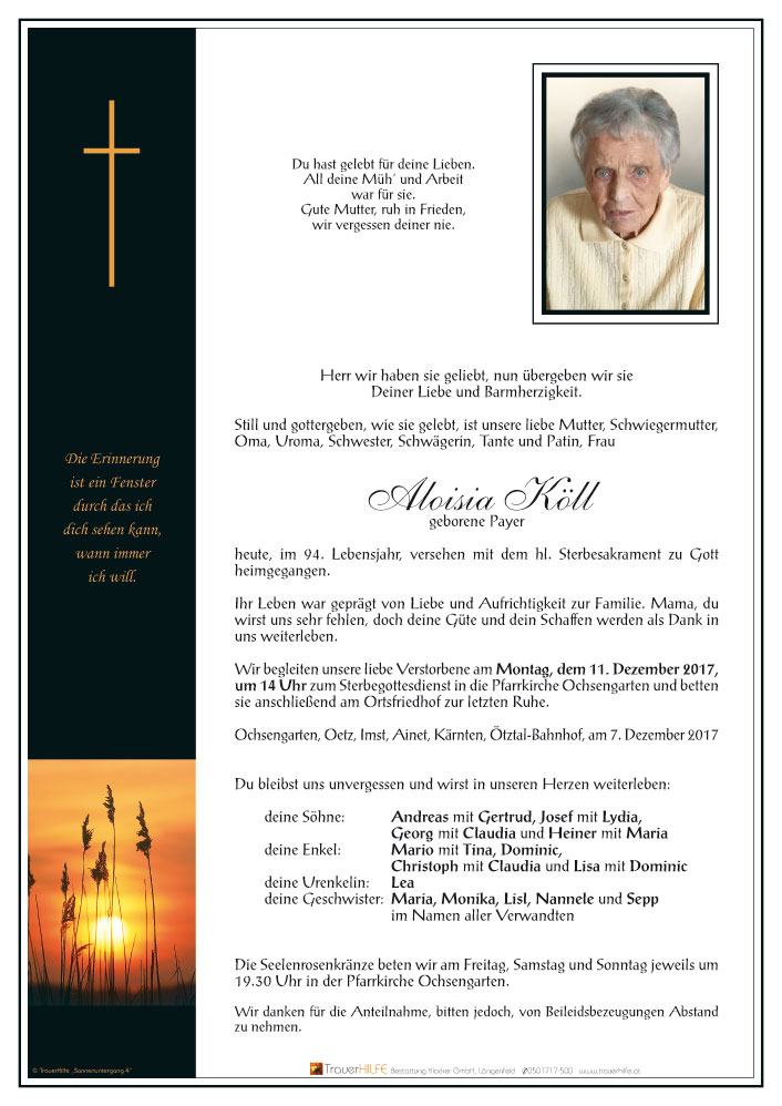 Das lange Leiden meiner Gotl hat nun ein Ende, die Mühen und Sorgen ihres Lebens konnte sie endgültig ablegen. In ihrer Bescheidenheit, ihrem Glauben und ihrer positiven Lebenseinstellung war sie uns allen ein großes Vorbild. Möge Gott der Herr, ihr all das Gute was sie getan hat vergelten. Meine Gotl wird in meinem Herzen und in der Erinnerung einen ewigen Platz finden.