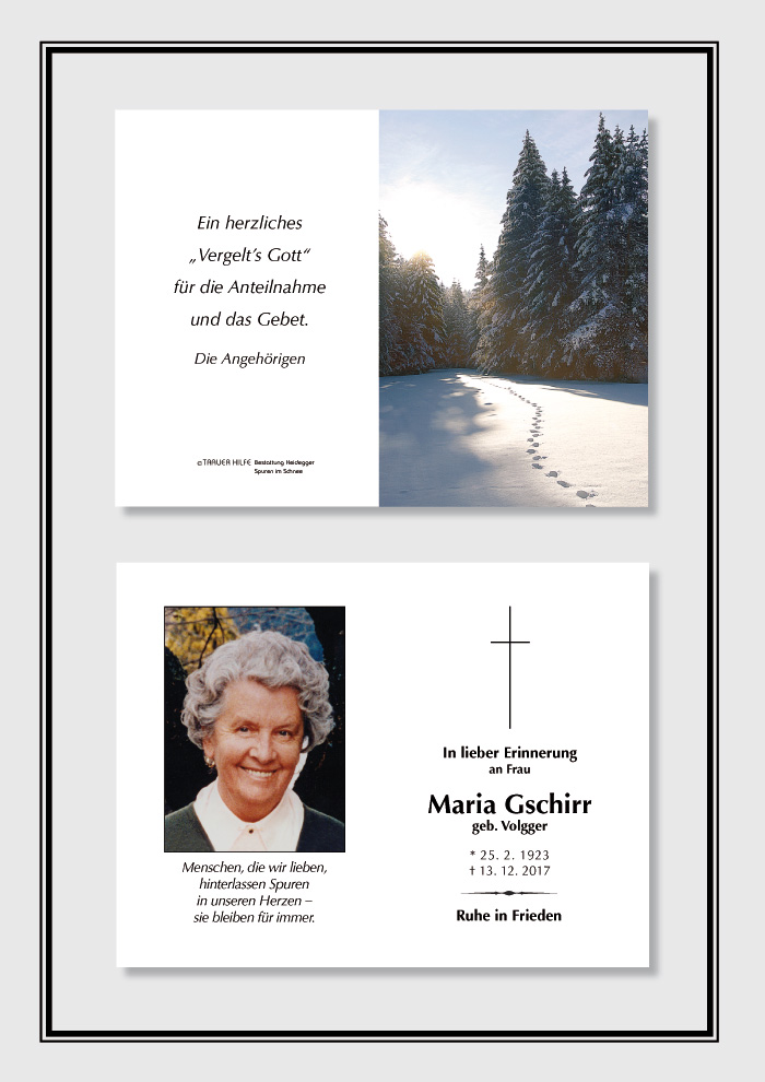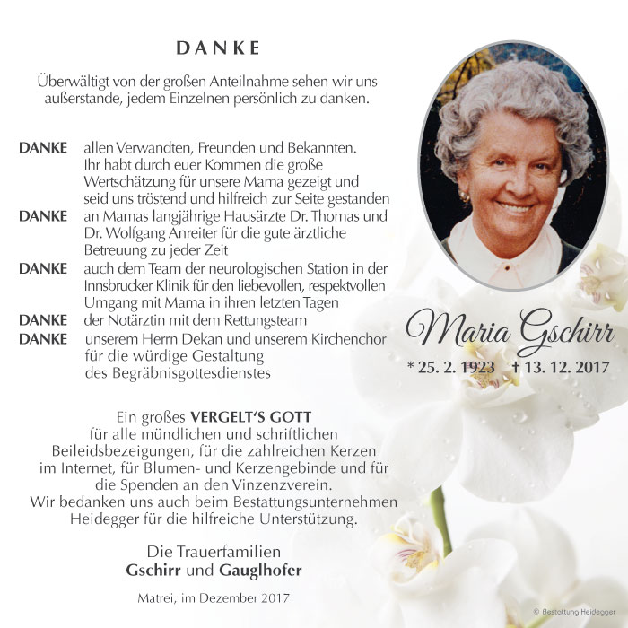 Bestattung wurde durchgeführt von: Karl Neurauter Karl Neurauter Bestattung Heidegger Brennerstraße 69 6150 - Steinach am Brenner Tel.: 05275 5211 zum Bestatter
