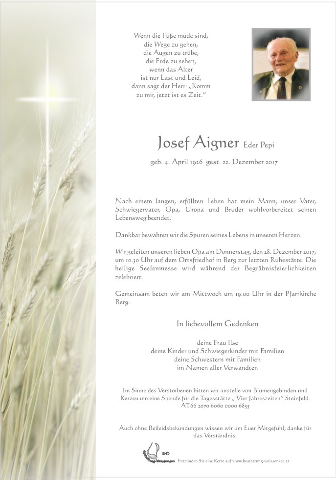 Bestattung wurde durchgeführt von: Markus Ertl Bestattung Weissensee Neusach 26 9762 - Weißensee Tel.: 04713 22 29 zum Bestatter