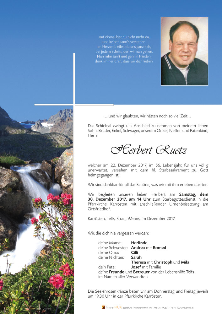 Wir möchten Euch unsere aufrichtige Anteilnahme zum Heimgang Herberts bekundenden und Euch mit unserem Gebet begleiten.29.12.2017 17:09 - Schennach Erika und Franz