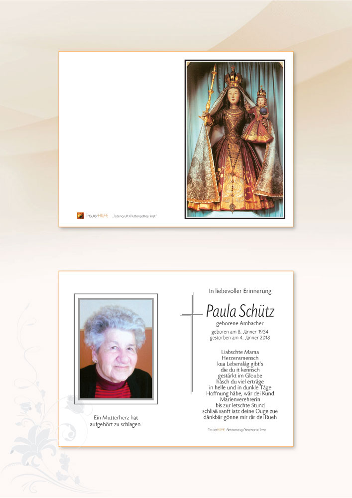 ausdrücken. Ich wünsche euch viele Erinnerungen an schöne Momente und gemeinsame Stunden mit eurer Mama und den Glauben an ihre Erlösung.