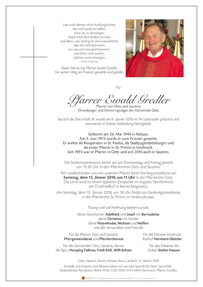 Die Worte, die Du für Dich als Priester ausgewählt hast sind so treffend und hast es auch gelebt.Wir haben viele schöne Stunden mit Dir und unseren besonderen Kindern von Glaube und Licht bei Dir im Widum verbracht. Herzlichen Dank!Gott wird Dir Alles vergelten. Eine dankbare Mutter.11.01.2018 23:06 - Fam.Angelika u. Helmut Stigger