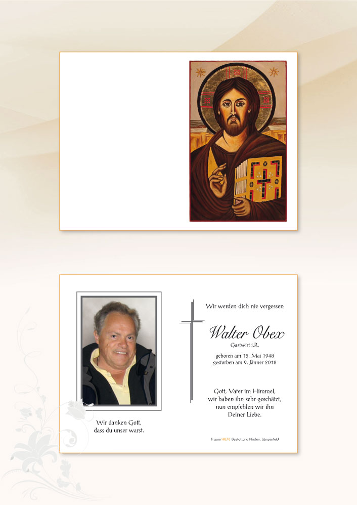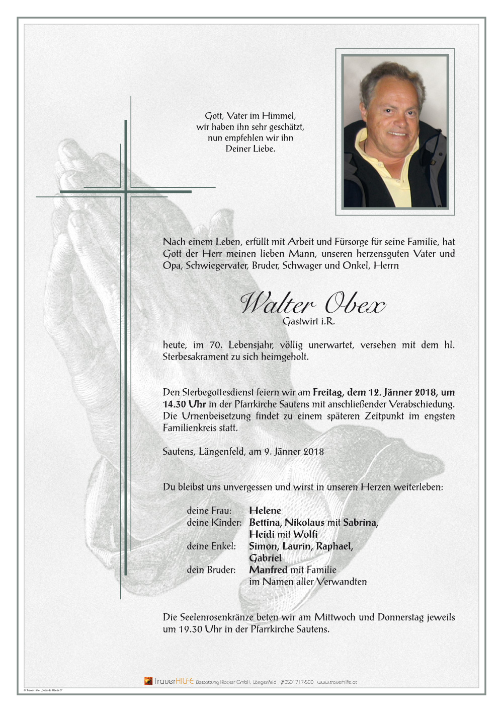 Ich weiss wie schmerzlich für Euch der Verlust von Eurem Mann, Papa und Opaist und ich möchte Euch mein innigstes Beileid aussprechen, habe den Walter sehr geschätzt und werde ihn sehr vermissen.