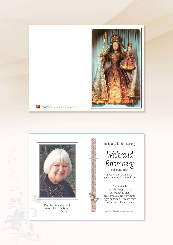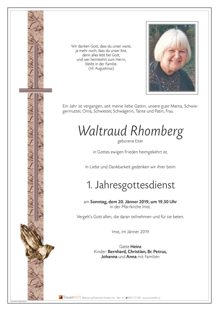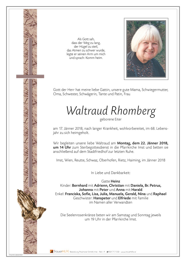Am Heimgang Deiner lieben Gattin, Eurer guten Mama, Schwiegermutter, Oma, Schwester, Schwägerin, Tante und Patin möchten wir Euch allen unser aufrichtiges Beileid aussprechen! Möge Euch der Herrgott viel Kraft schenken in dieser schweren Zeit! Wir werden Waltraud stets in lieber Erinnerung behalten!