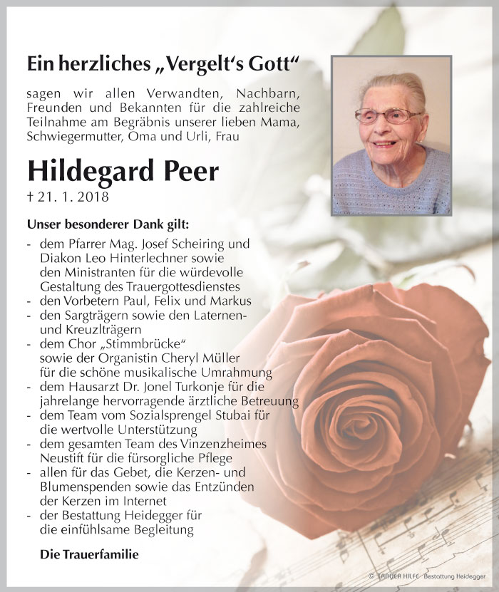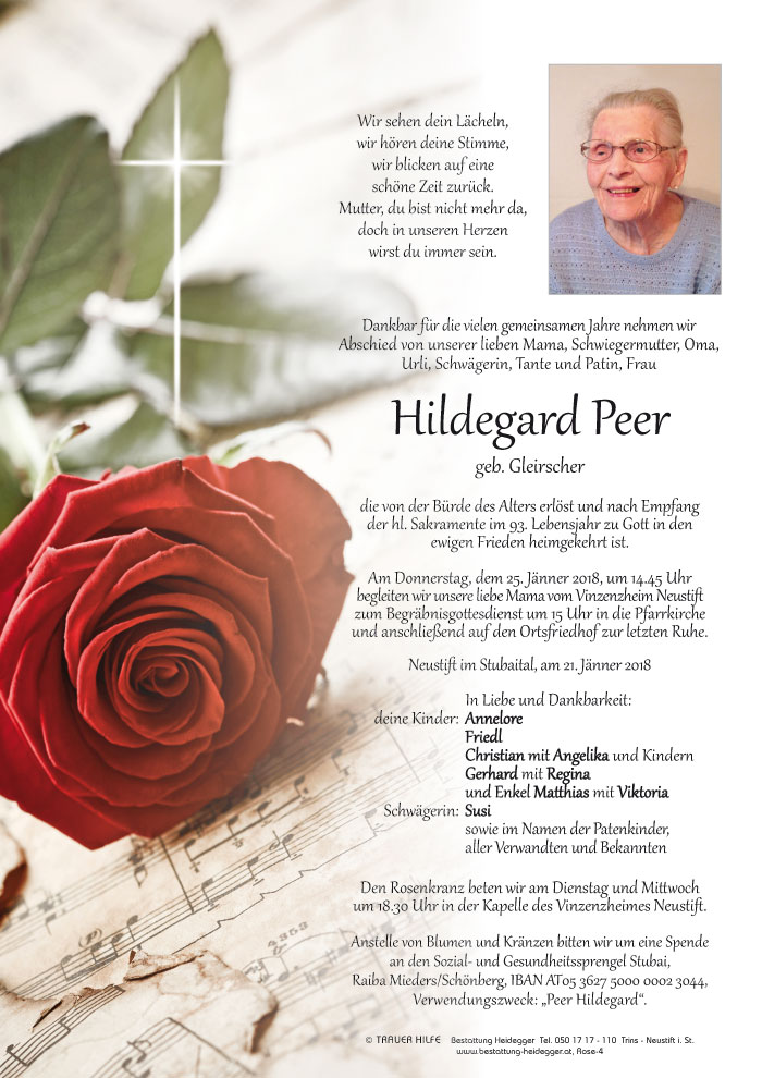 Bestattung wurde durchgeführt von: Karl Neurauter Karl Neurauter Bestattung Heidegger Brennerstraße 69 6150 - Steinach am Brenner Tel.: 05275 5211 zum Bestatter