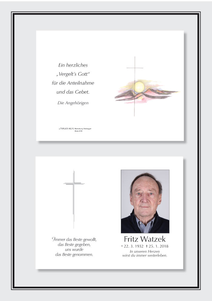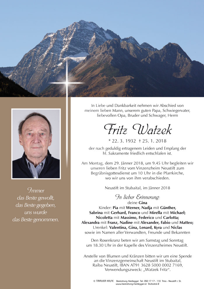 Es ist schwer,seinen Mann, seinen Papa zu verlieren.Die Gedanken erinnern sich an Worte von ihm,anTaten von ihm und ein Stück von all\'dem Erlebten bleibt in unserem Herzen drin. Ein Stück in lieber Erinnerung an ihn bleibt bestehn. So bleiben wir für immer verbunden von Herz zu Herz. Und sagen im Gedanken zu ihm:" Schon dass du da wahrst,Fritz28.01.2018 22:32 - Aufrichtige Anteilnahme deine ehemahlige Nachbarin Manuela Schwaiger