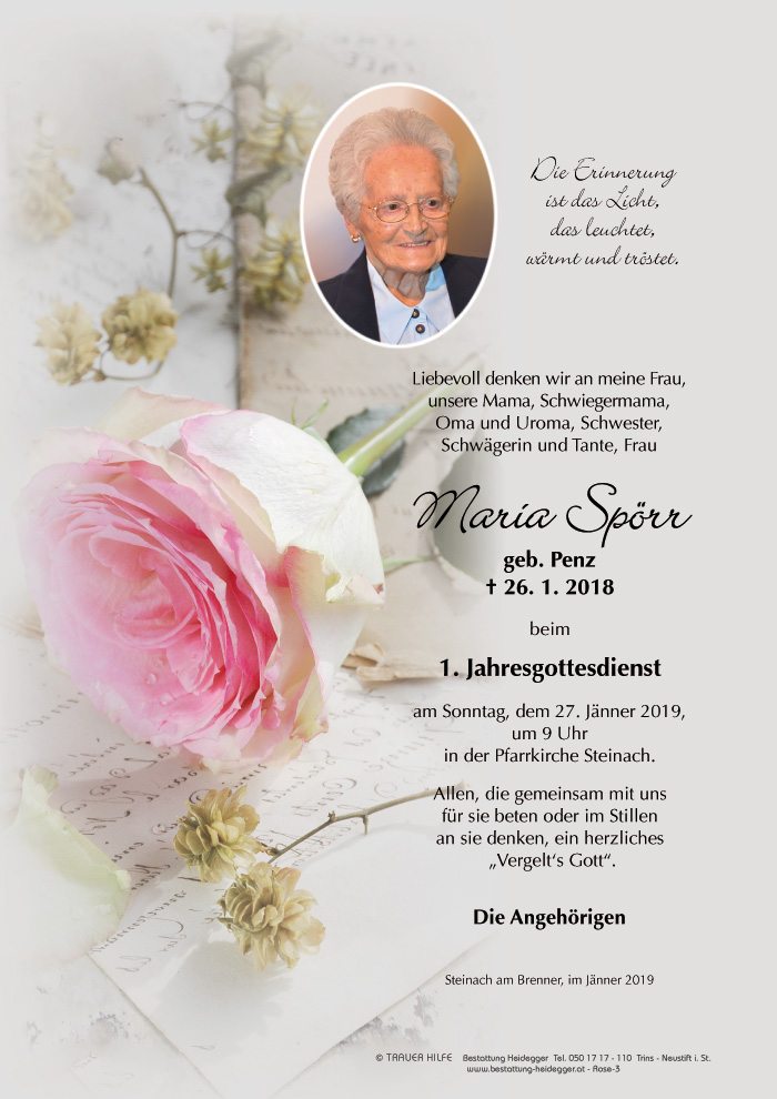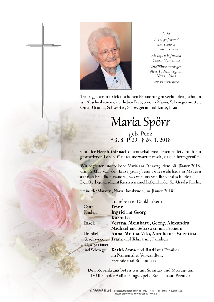 Bestattung wurde durchgeführt von: Karl Neurauter Karl Neurauter Bestattung Heidegger Brennerstraße 69 6150 - Steinach am Brenner Tel.: 05275 5211 zum Bestatter