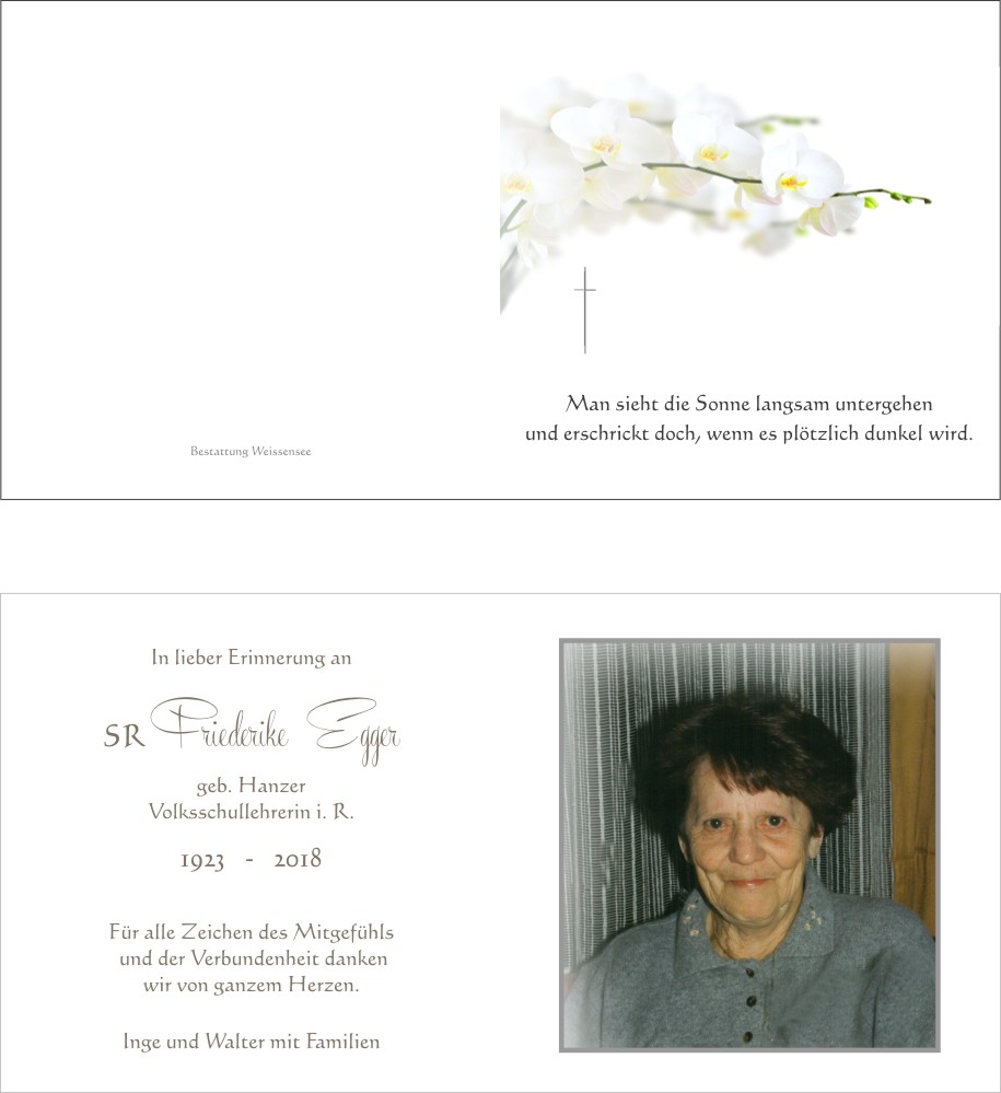 Ich empfinde große Dankbarkeit, dass ich die liebe Frau Egger einige Jahre ihres Lebens begleiten durfte. Wir haben miteinander gelacht und auch geweint. Ich habe viel gehört und gelernt. Sie wird auch mir fehlen. DANKE!