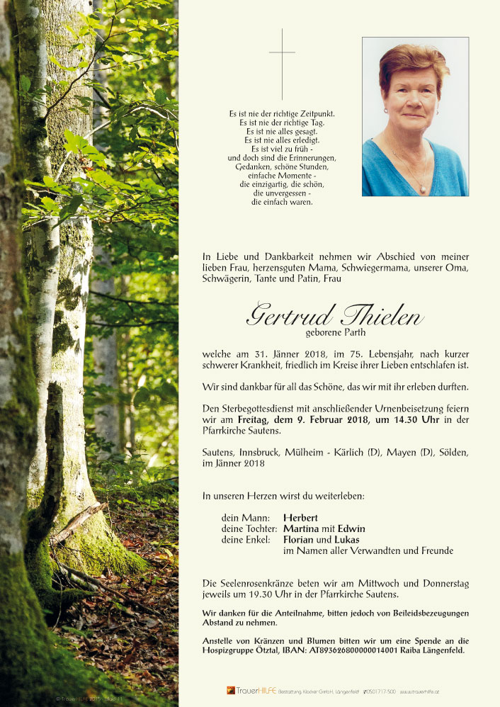 Euch aber wünschen wir viel Kraft für die kommende Zeit des Loslassens und, dass jede Erinnerung an eure Gertrud, euch wie ein wärmender Sonnenstrahl begleitet.