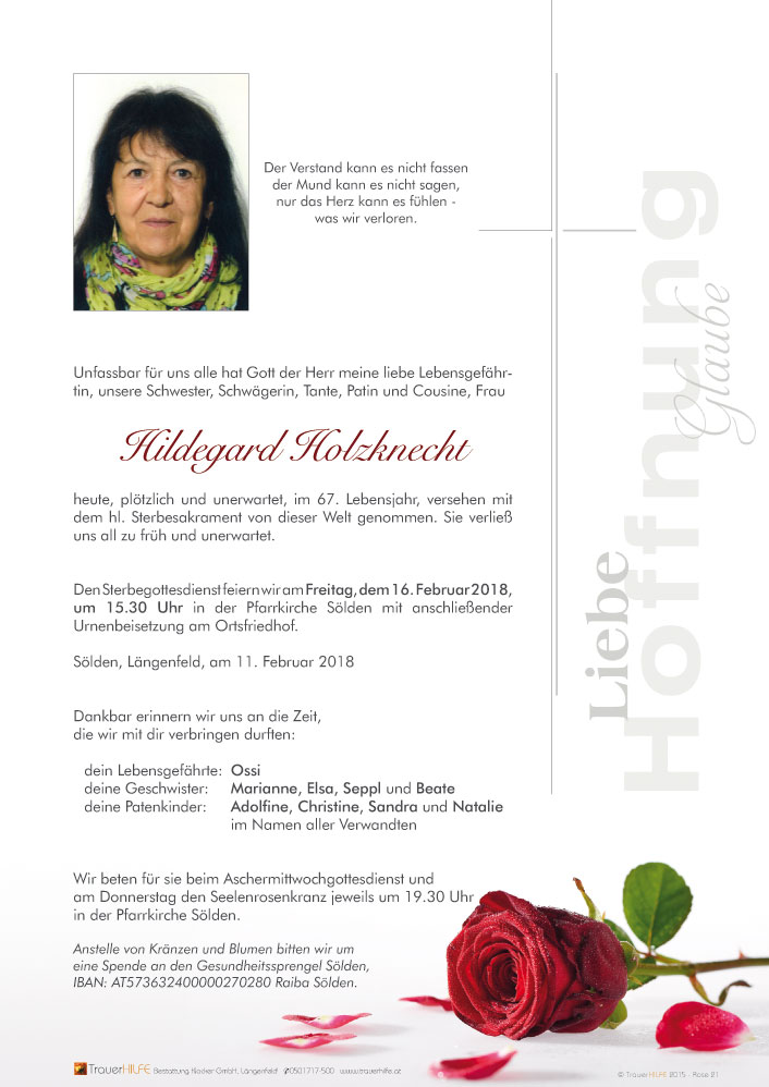 leise trauern wir mit euch und möchten auf diesem Wege unser herzlichstes Beileid und aufrichtiges Mitgefühl zum Tode eurer Hildegard aussprechen.