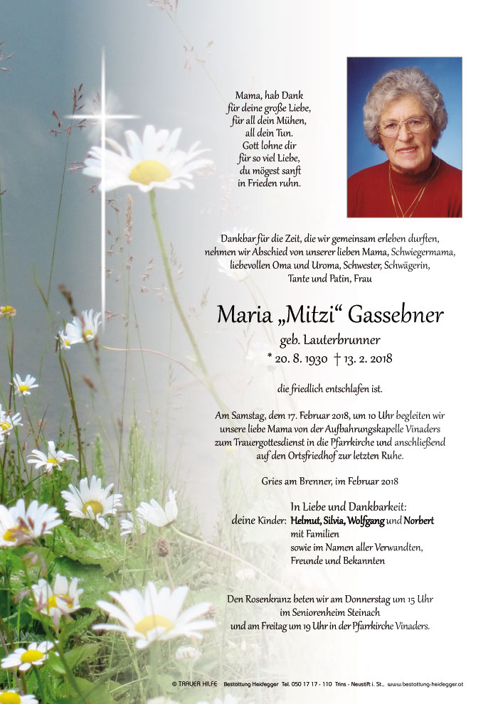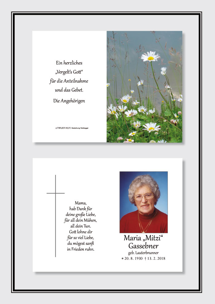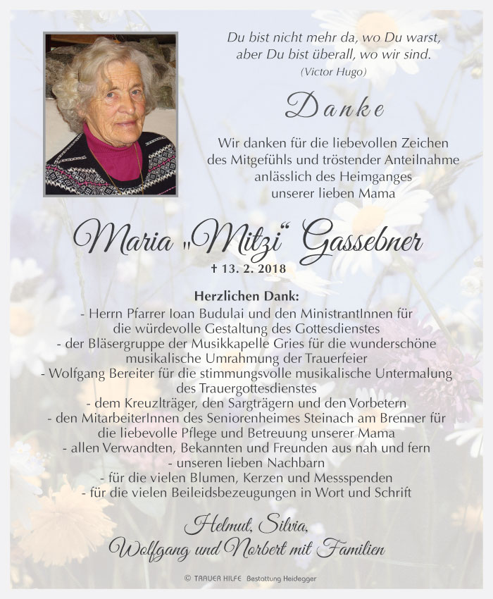 Bestattung wurde durchgeführt von: Karl Neurauter Karl Neurauter Bestattung Heidegger Brennerstraße 69 6150 - Steinach am Brenner Tel.: 05275 5211 zum Bestatter