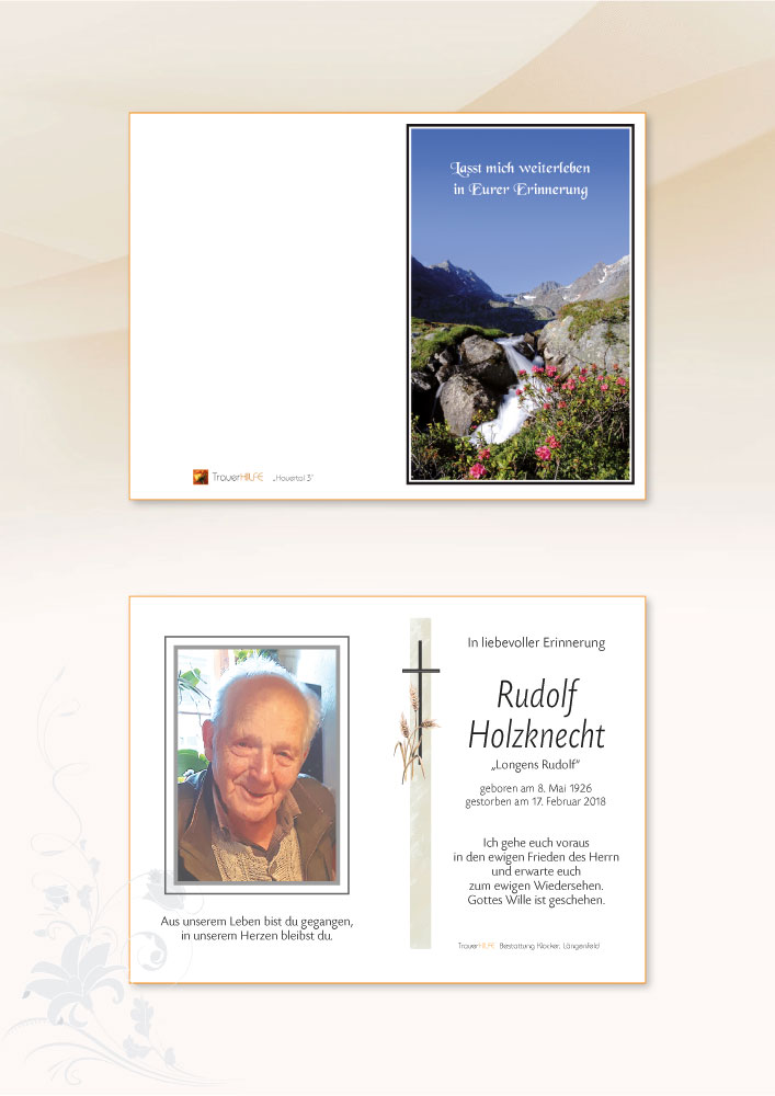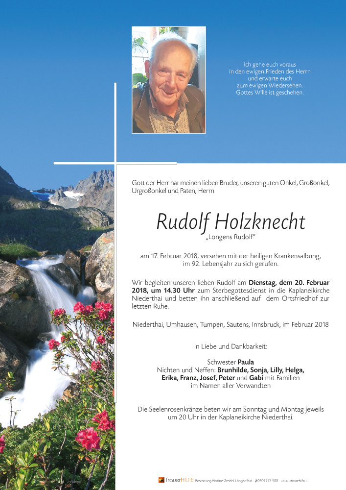 Liebe Paula, Gerlinde und Josef! Zum Ableben eures Bruders und Onkels sprechen wir unser innigstes Beileid aus. Wir haben Rudolf als freundlichen und ruhigen Menschen in Erinnerung. Der Herr schenke ihm die ewige Freude. Berta, Hildegard und Egon
