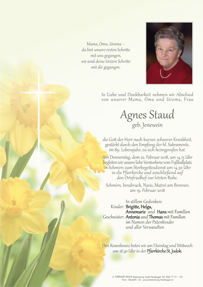 Wir möchten euch anlässlich des Ablebens eurer Mama unser herzliches Beileid aussprechen. Es ist immer schwer, nach dem Weggehen eines Angehörigen die richtigen Worte zu finden. Jeder verbindet mit dem Verstorbenen seine eigenen, ganz speziellen Erinnerungen. Die Geschichten, die wir mit Agnes verbinden, beziehen sich zwar immer nur auf kurze Zeiten in den Ferien oder in unseren Urlauben in Tirol, dennoch war die Zeit, die wir bei eurer Familie verbracht haben, immer intensiv und damit verbunden, wird auch eure Mama uns immer in guter Erinnerung bleiben.