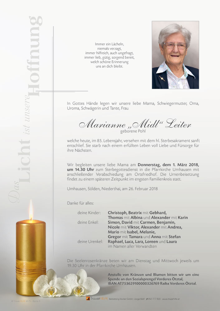 Nun dankt Gott, dass er sie erlöst hat und denkt immer daran, als sie euch brauchte, ward ihr da und das ist das schönste, was ihr eurer Mama zum Abschied geben konntet. Das wird euch an manchen Tagen ein Trost sein. Wir werden eure Midl in liebevoller Erinnerung behalten.