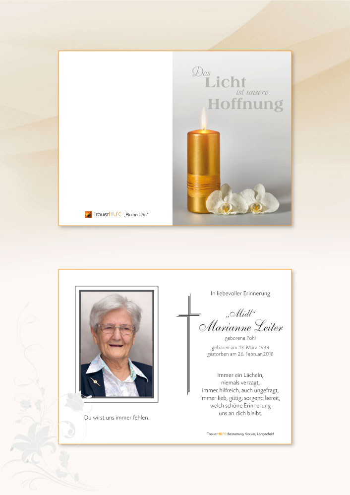 Neue Kerze für Marianne Leiter entzünden.
