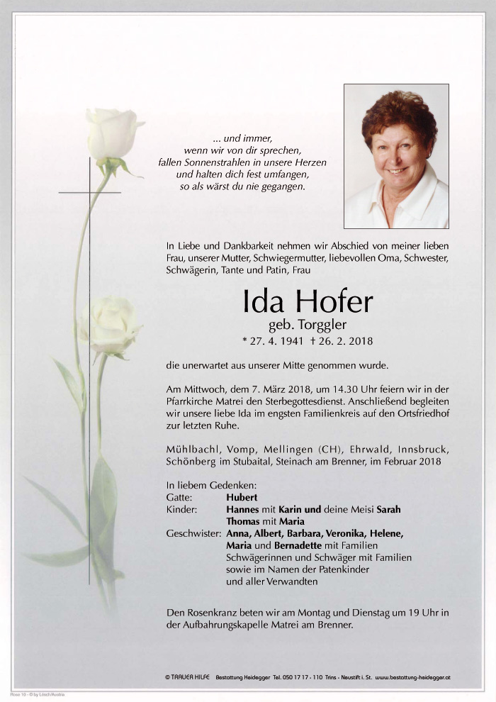 Bestattung wurde durchgeführt von: Karl Neurauter Karl Neurauter Bestattung Heidegger Brennerstraße 69 6150 - Steinach am Brenner Tel.: 05275 5211 zum Bestatter
