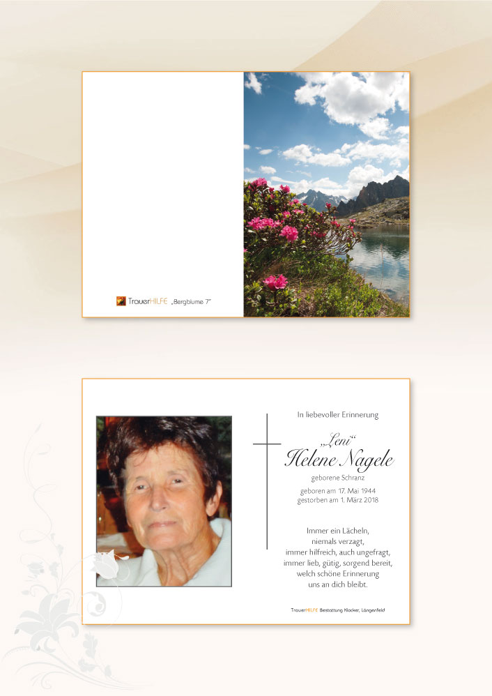 Vielleicht kann dieses Zitat des Propheten Jesaja aus dem Alten Testament etwas Trost und Hoffnung spenden. Auch ich kannte schon als Kind Tante Leni immer krank und dennoch bewunderte ich ihren Fleiß und Arbeitswillen. In dieser Stunde der Trauer möchte ich aber besonders die vorbildliche Betreuung durch die Familie hervorheben. Im Besonderen die bis zum Tod unverbrüchliche Treue Rolands zu Tante Leni. Meine Mutter hat in ihren letzten Tagen des Ablebens immer sehr viel Gutes über Leni und Roland zu erzählen gewusst. Für die Unterstützung und Hilfe von eurer Seite an meine Mutter möchte ich mich nun an dieser Stelle nochmals ganz besonders bedanken!