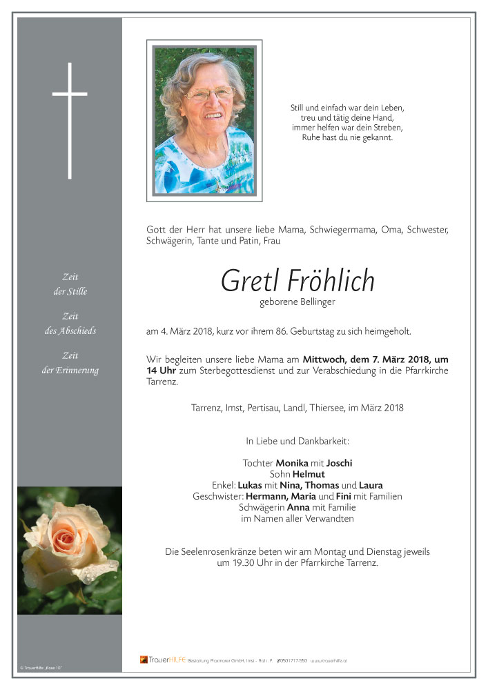 Ich erinnere mich mit Freude an den Tag, als wir mit Christine bei Oma Gretl in Tarrenz einkehrten. Sie empfing uns mit Herzlichkeit und Redseligkeit. Christine erzählte uns oft von ihrer Schwiegermama. Nun sind die beiden in Gottes Güte und Gnade beisammen, mit all den Lieben, die euch vorausgegangen sind. Gottes Engel mögen Gretl begleiten. Gottes Liebe und Segen wünsche ich euch von ganzem Herzen.