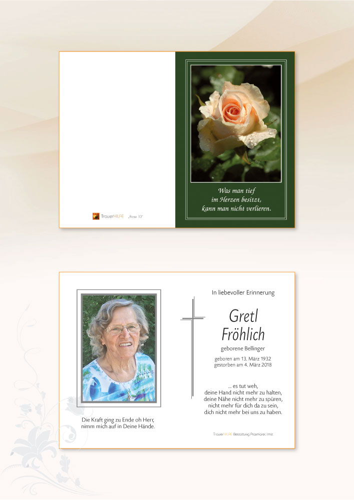 Ihr Leben war ein Vorbild für alle! Sie hat viel ertragen müssen, hat aber alles in wunderbarer Weise gemeistert. Mit deiner Schwester und den vielen dir wohlgesinnten Freunden wirst du, Helmut, sicher stark genug sein, den teuren Verlust zu verschmerzen! Liebe Gretl, rip