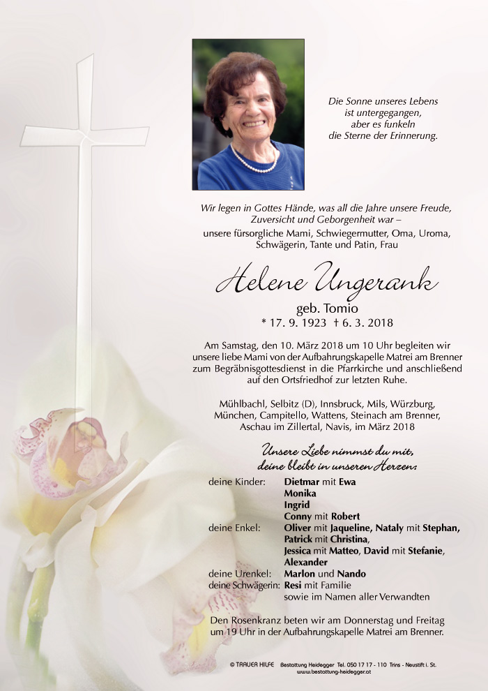 Bestattung wurde durchgeführt von: Karl Neurauter Karl Neurauter Bestattung Heidegger Brennerstraße 69 6150 - Steinach am Brenner Tel.: 05275 5211 zum Bestatter