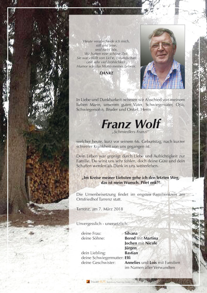 Franzl, mein Schulkolleg - wir zwei haben so manches tolle Erlebnis aus unserer gemeinsamen Volksschulzeit in lebendiger Erinnerung bewahrt. Nun bist du, "Schmidlers Franzl", einfach so hinüber gegangen in eine andere Welt. Mögest du, Sylvana, stark genug sein, den Schmerz zu meistern. Franzl, r.i.p.