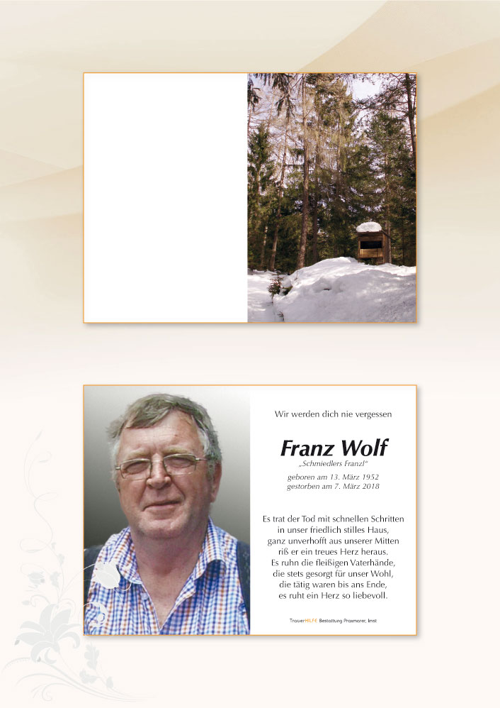 Danke für die Stunden die wir mit dir gemeinsam erleben durften .Du gingst fort ohne ein Wort an einem Ort namens Paradies. Den Ort den wir noch alle betreten müssen. Wo die alpenrosen und edelweis für immer blühen. Die Bäche rauschen ins Tal mit lautem Klang.die Nebel lautlos ziehen und der Wind spielt ewig seine Melodien. Franz du bist nicht fort.Du bist nur voraus im Paradies. Danke und weidmans Ruh. Karl mrak und jagdkollegen. Imst oberstadt.