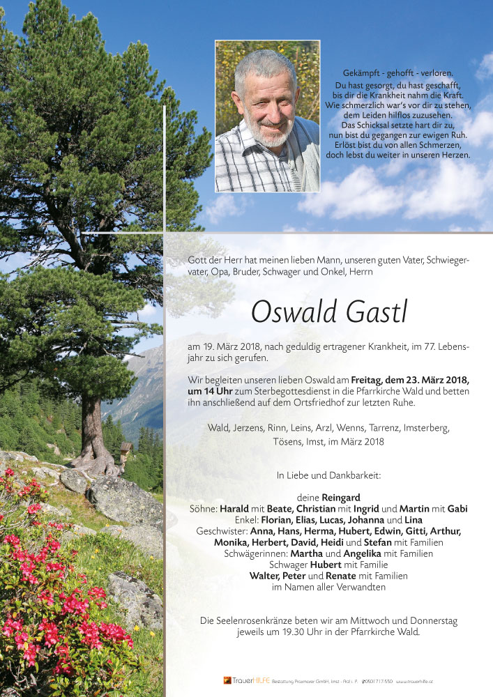 traurig und schweren Herzens haben wir den Heimgang von Eurem lieben Ossi vernommen. Wir haben mit Euch bis zuletzt gehofft, bis Ossi die Kraft verließ. Seit vielen Jahren ist uns Ossi sehr vertraut. Sein verschmitztes Lächeln, sein trockener Humor und seine Herzlichkeit haben uns immer sehr erfreut. Unvergessen bleibt sein stets freundliches Winken aus dem Küchenfenster, wenn wir zu Besuch waren. Er wird auch uns fehlen. Liebe Johanna und Lina, tragt Euren guten Opa im Herzen, er wird Euch nahe sein, wird Euch leiten und beschützen. Liebe Reingard, unermesslich war Deine Kraft, Ossi auf seinem schweren Leidensweg zu begleiten. Möge es Euch allen Trost sein, ihn im ewigen Frieden zu wissen. In Gedanken und in herzlicher Verbundenheit bei Euch ...