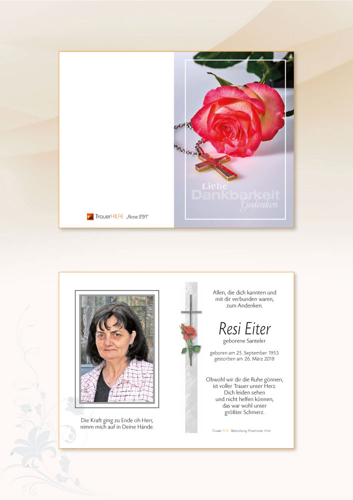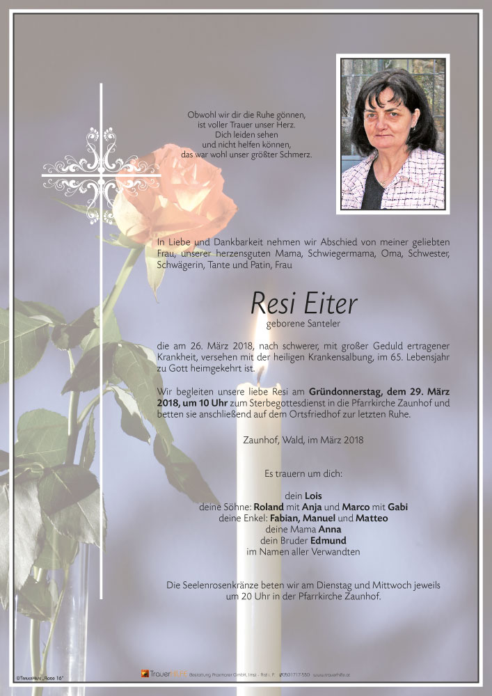 Wir möchten der Familie Eiter unsere Anteilnahme ausdrücken. Das Schicksal von Frau Eiter hat uns tief berührt... wir sind überzeugt dass sie nun an einem Ort sein kann , frei von Sorgen und Schmerzen und auf euch aufpasst. Es war schön wie ihr als Familie ihr die letzten Stunde beigestanden seid und sie dann gelöst Ihre letzte Reise antreten konnte.