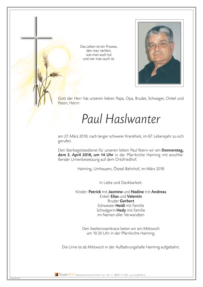 Geschätzte Trauerfamilie. Pauli wird uns als kompetenter Versicherungsberater, guter Freund und geselliger Kamerad für immer in Erinnerung bleiben. Was haben wir doch gemeinsam gemütliche Stunden verbringen dürfen. Lebe wohl in der anderen Welt, alter Freund.