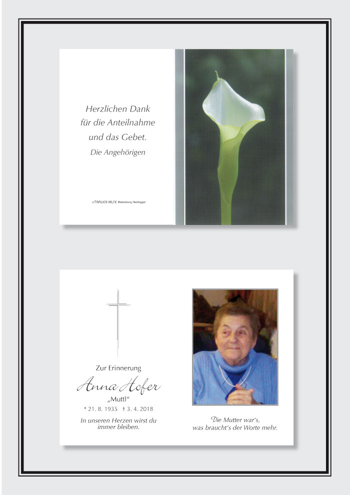 Bestattung wurde durchgeführt von: Karl Neurauter Karl Neurauter Bestattung Heidegger Brennerstraße 69 6150 - Steinach am Brenner Tel.: 05275 5211 zum Bestatter