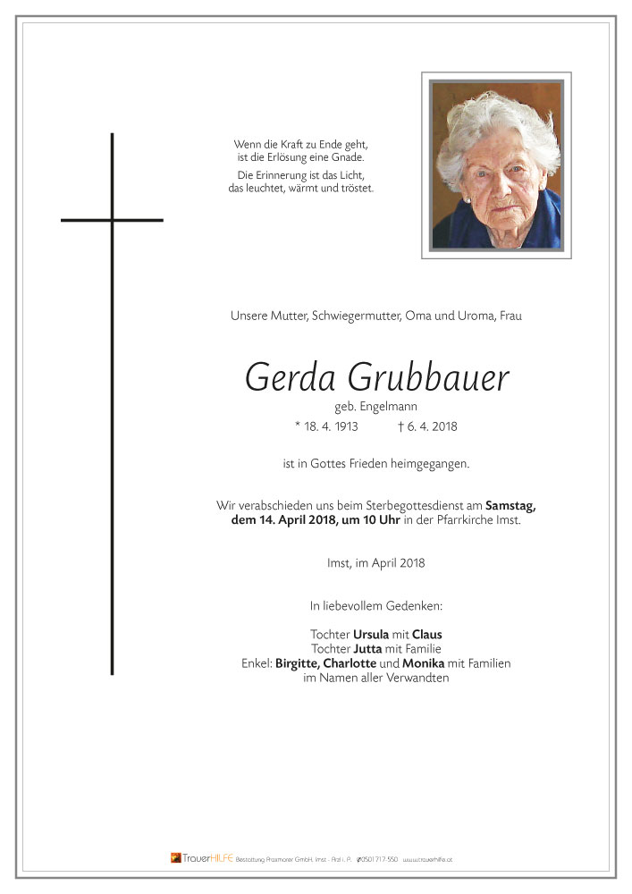Am Heimgang Eurer lieben Mutter, Schwiegermutter, Oma und Uroma möchten wir Euch allen unser aufrichtiges Beileid aussprechen! Möge Euch der Herrgott viel Kraft schenken in dieser schweren Zeit! Wir werden Eure Mutter stets in lieber Erinnerung behalten!