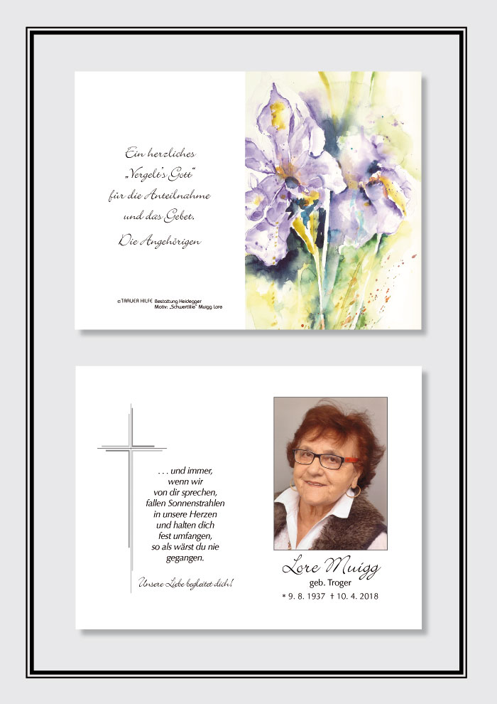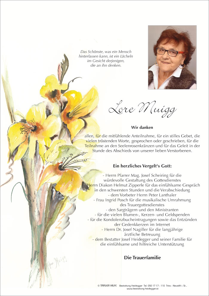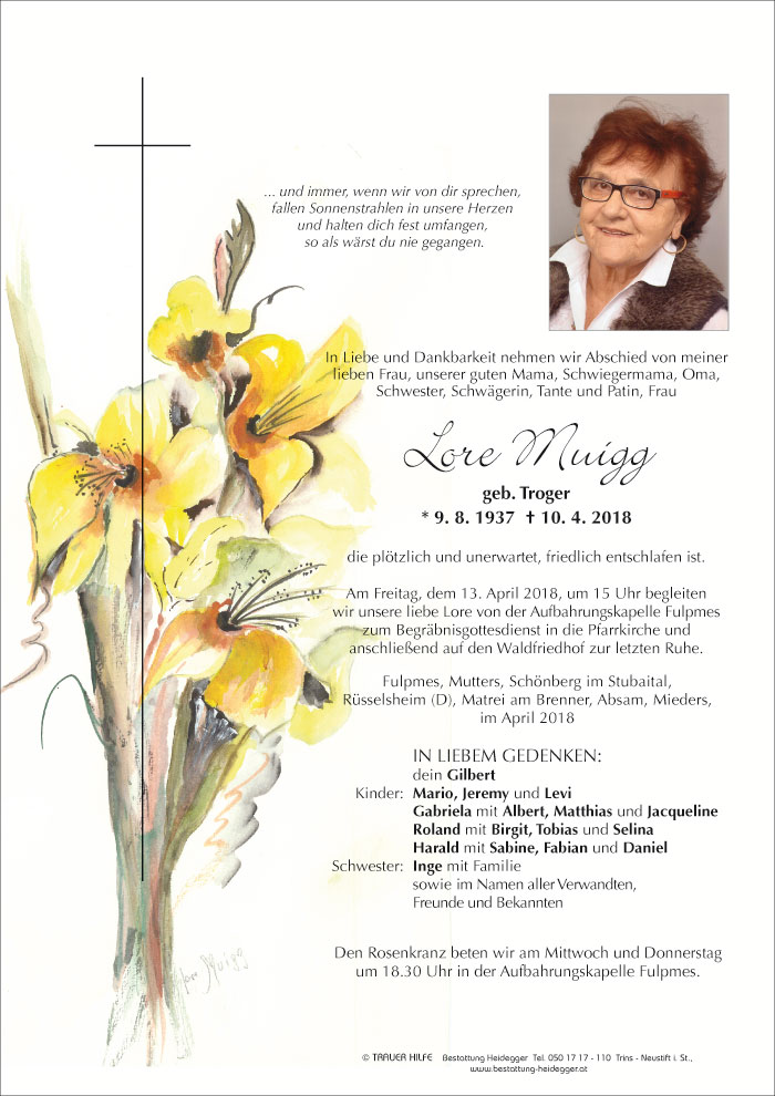 Tief betroffen über die Nachricht des so plötzlichen Todes Deiner lieben Frau, Eurer Mama und Oma, möchten wir unser tiefes Mitgefühl ausdrücken! Lore war einfach einzigartig und man kann gar nicht beschreiben, wie viele Talente und wunderbare Eigenschaften sie hatte und darum wird sie einfach unsterblich sein! Die Erinnerungen an ein wunderschönes und ausgefülltes Leben an ihrer Seite mögen Dir und Euren Kindern mit Familien Trost und Kraft geben, die kommende schwere Zeit zu meistern und ich bin sicher, sie wird immer an Eurer Seite sein ! In Verbundenheit