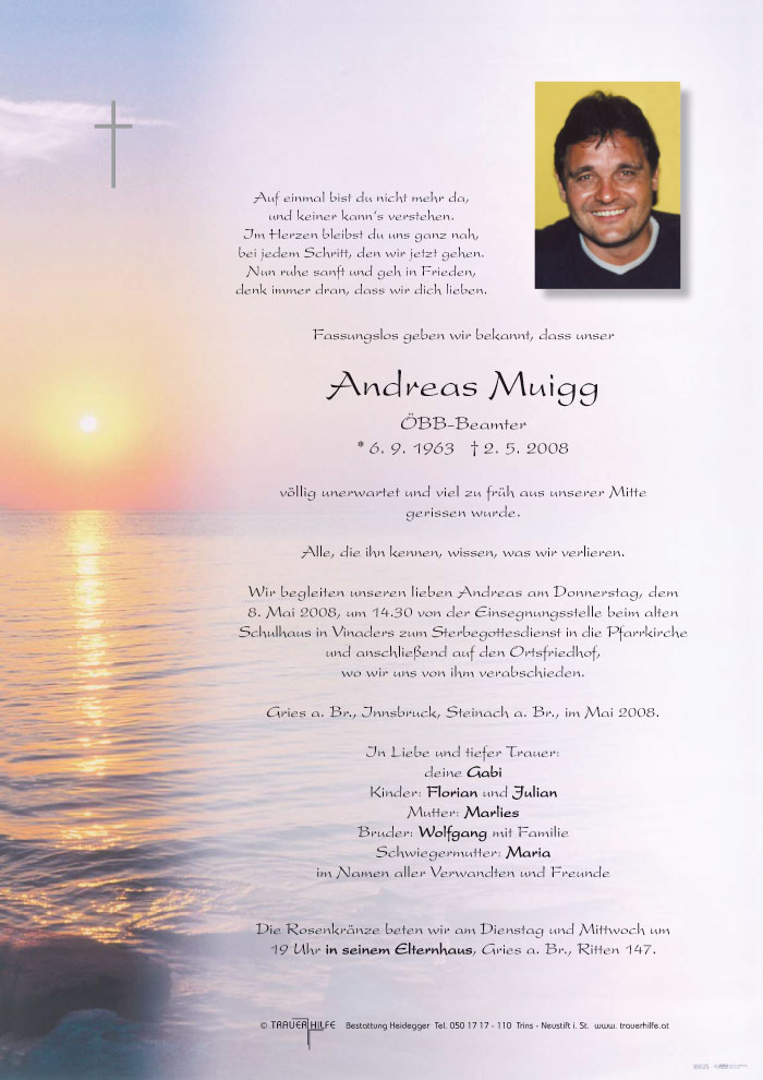 Bestattung wurde durchgeführt von: Karl Neurauter Karl Neurauter Bestattung Heidegger Brennerstraße 69 6150 - Steinach am Brenner Tel.: 05275 5211 zum Bestatter
