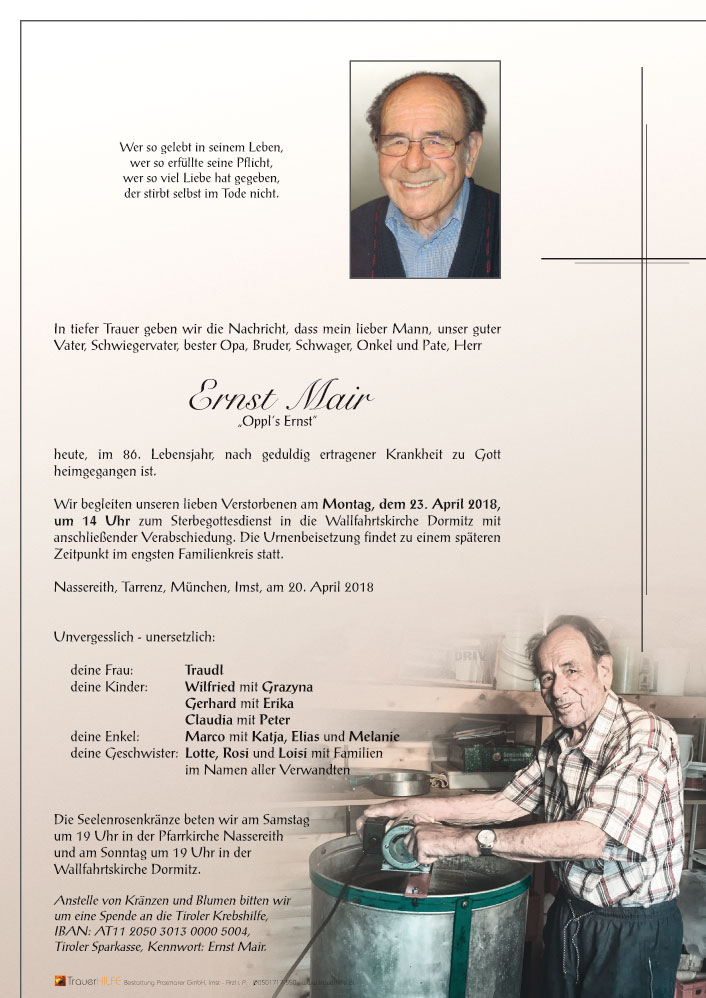 Neue Kerze für Ernst Mair entzünden.