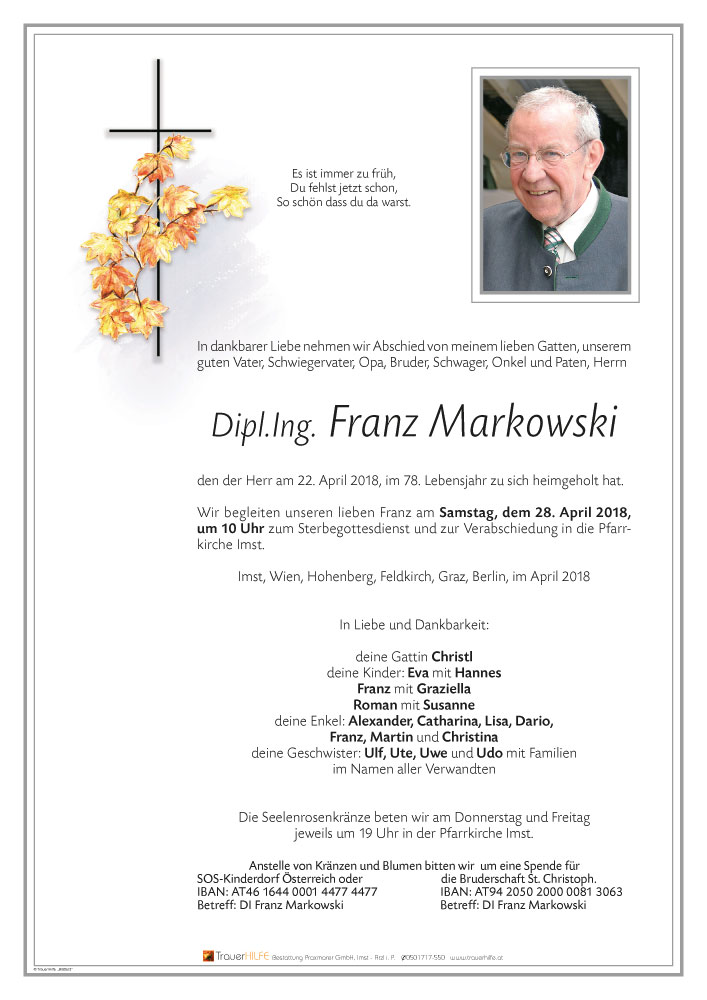 Mit tiefer Betroffenheit habe ich leider erst heute die Nachricht vom Heimgang deines Vaters Franz erhalten. Ich möchte dir und all den Angehörigen meine aufrichtige Anteilnahme aussprechen und werde deinen Vater immer als Mensch und Fachmann in guter Erinnerung behalten, jede auch noch so kurze Unterhaltung mit ihm war eine große Freude.