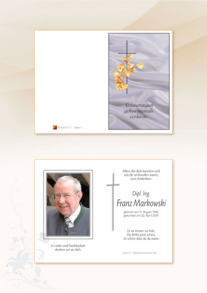 Aus eigener leidvoller Erfahrung weiß ich, daß noch so gut gemeinte Trostesworte nicht den Schmerz über den Verlust eines geliebten Menschen zu lindern imstande sind. Trotzdem sollst Du wissen, daß ich in dieser für Dich und Deiner lieben Familie so schweren Zeit im Gedanken bei Euch bin und - weil ich fest auf Gottes Liebe vertraue - für Franz und auch für Euch beten werde.