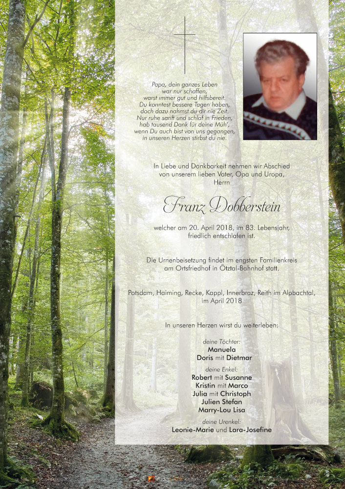 Bestattung wurde durchgeführt von: Daniel Klocker Bestattung Klocker GmbH Oberlängenfeld 41 6444 - Längenfeld Tel.: 05253 5561 zum Bestatter