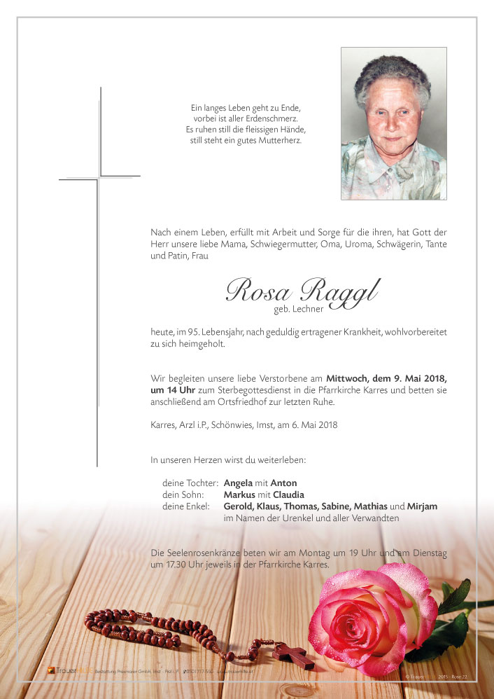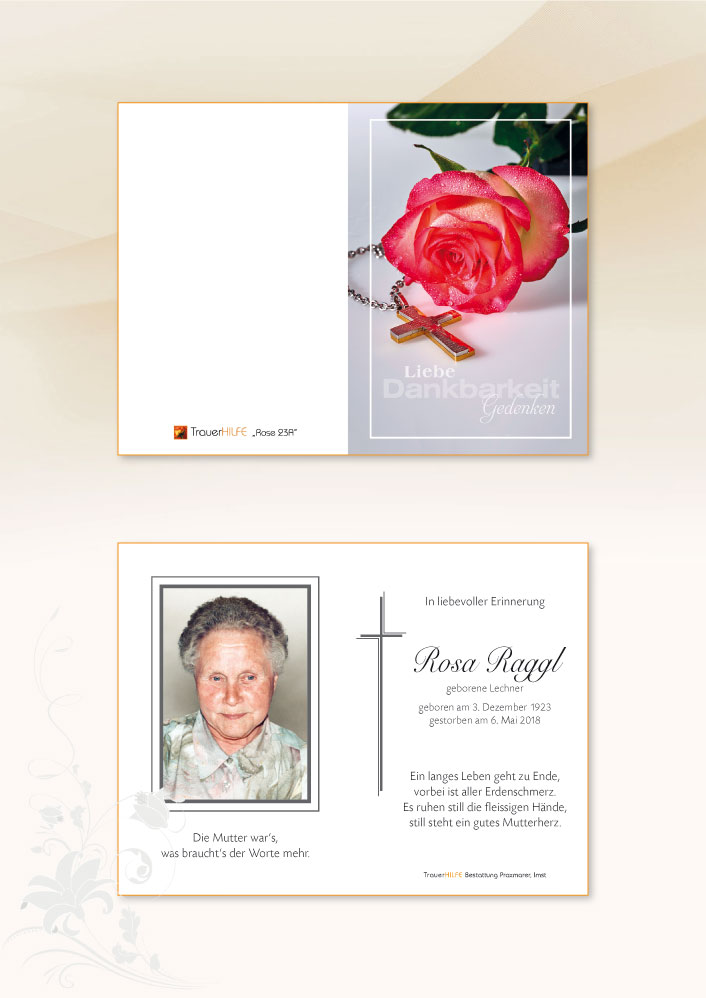Wir durften Rosa ein Stück ihres langen Lebens begleiten und werden sie in guter Erinnerung behalten. Wir entbieten unser herzliches und aufrichtiges Beileid und wünschen euch weiterhin viel Kraft,