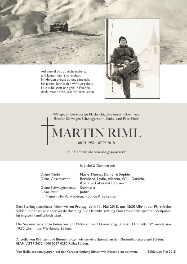 Wünsche allen Angehörigen der Familie Riml und besonders den Kindern von Martin viel Kraft in dieser schweren Zeit. Die lockere Plauderei mit Ihm im Sonnblick wird mir immer in Erinnerung bleiben. Bin selber im Moment wie gelähmt ab dieser Nachricht