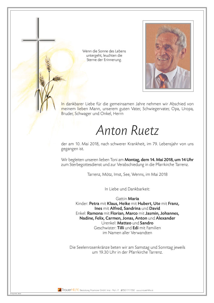 Für meine Schwester und ihre Kinder. Toni war ein Mann mit einem ganz großen Herzen und einem feinen spöttischen Humor,so haben wir ihn alle gekannt und geliebt. Deine Liebe hat ihn bis zum letzten Atemzug begleitet und dafür ist jeder Dank zu klein. Meine lieben Mädchen haltet alle zusammen , so trägt sich der Schmerz leichter! Ich wünsche euch allen viel Kraft! Edelgard