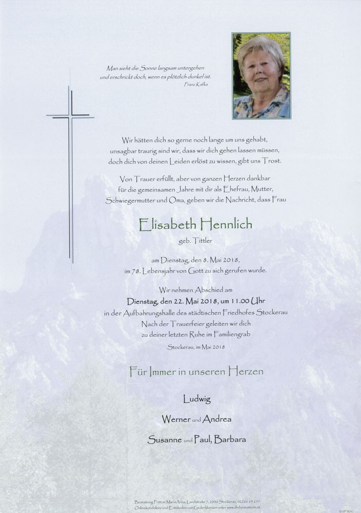 Bestattung wurde durchgeführt von: Frittum Maria Anna TrauerHilfe Bestattung Frittum Bahnstrasse 255 2041 - Wullersdorf Tel.: 050 1717-600 zum Bestatter