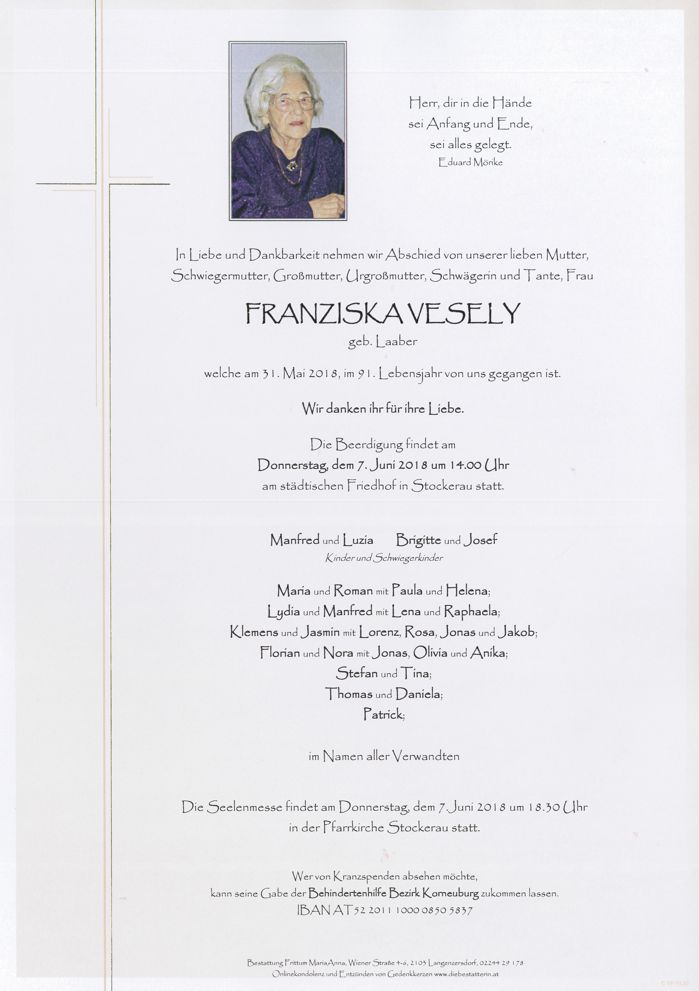 Bestattung wurde durchgeführt von: Frittum Maria Anna TrauerHilfe Bestattung Frittum Bahnstrasse 255 2041 - Wullersdorf Tel.: 050 1717-600 zum Bestatter