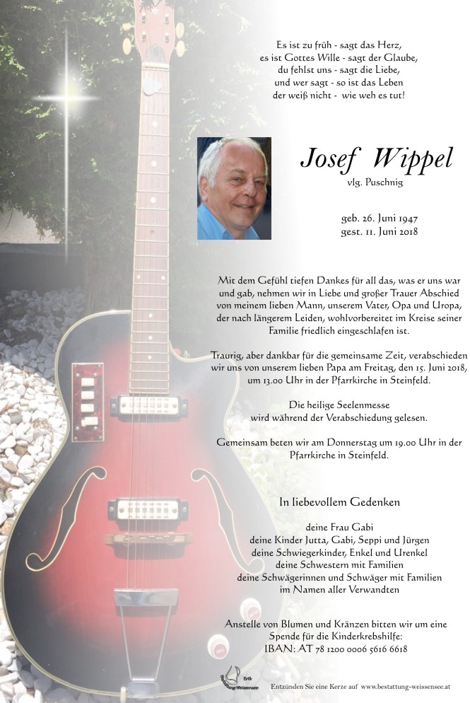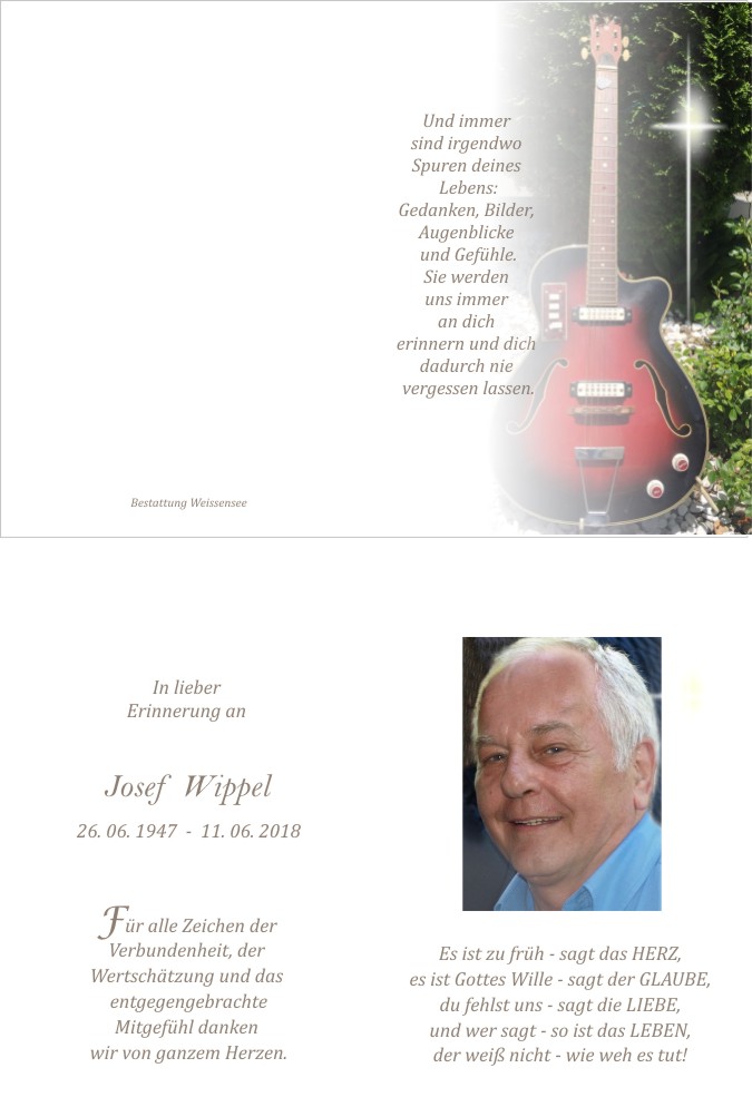 Eine Stimme die uns vertraut war schweigt, ein Mensch der uns lieb war ging, was uns bleibt Liebe, Dank und Erinnerung. Danke Onkel Sepp dass ich dich kennen lernen durfte, warst ein herzensguter Mensch, Gerald, Anita, Sandra und David.