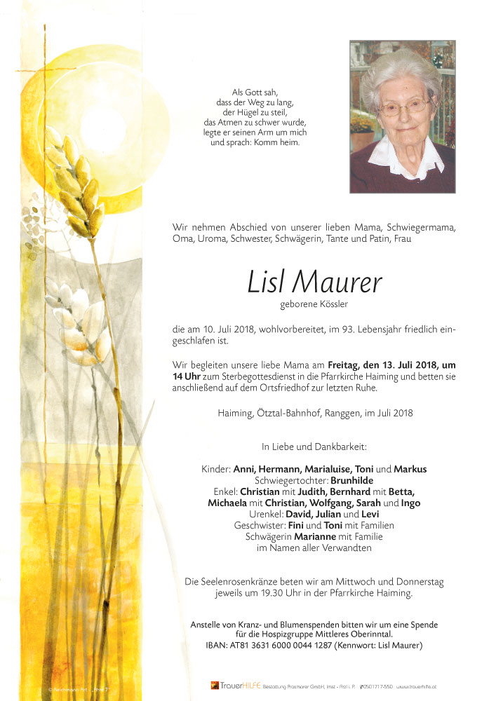 Mit aufrichtiger Anteilnahme wünschen wir euch viel Kraft in dieser schweren Zeit und werden Lisl in dankbarer und liebevoller Erinnerung behalten.