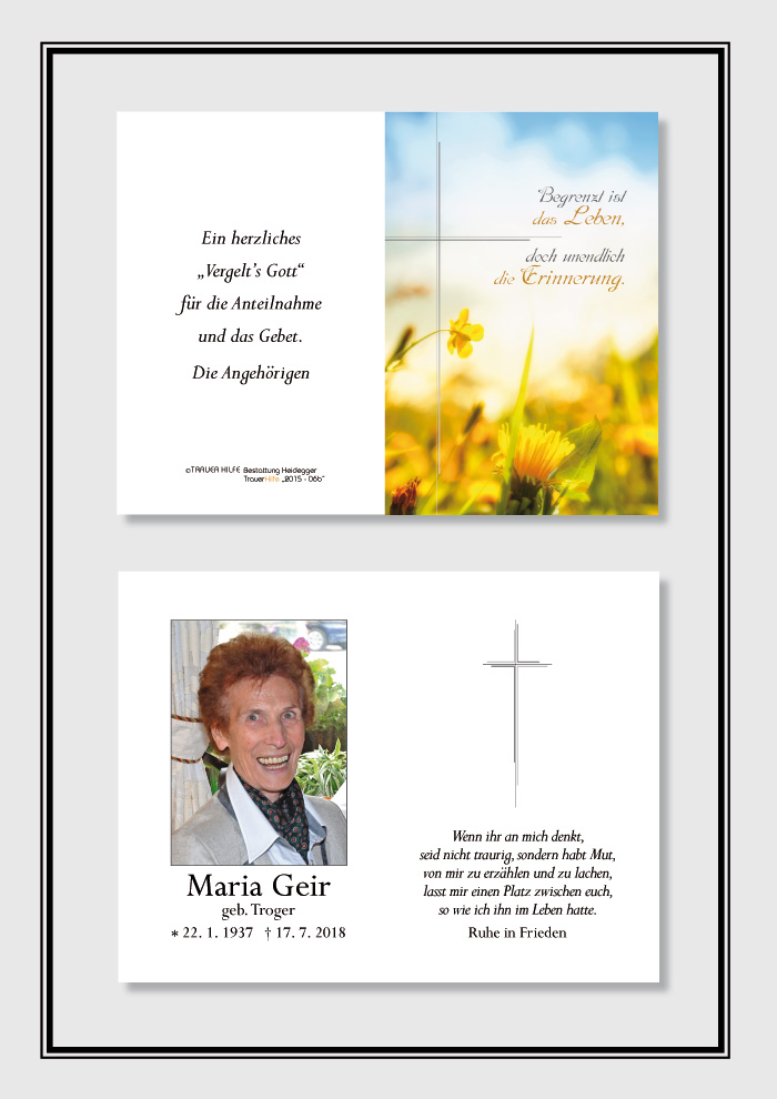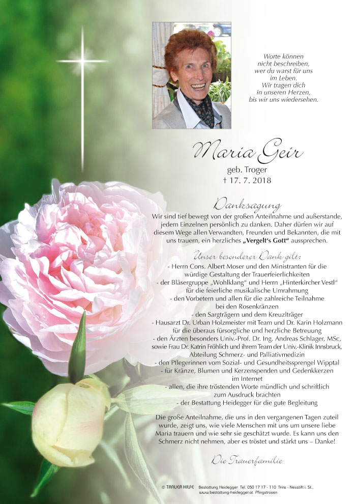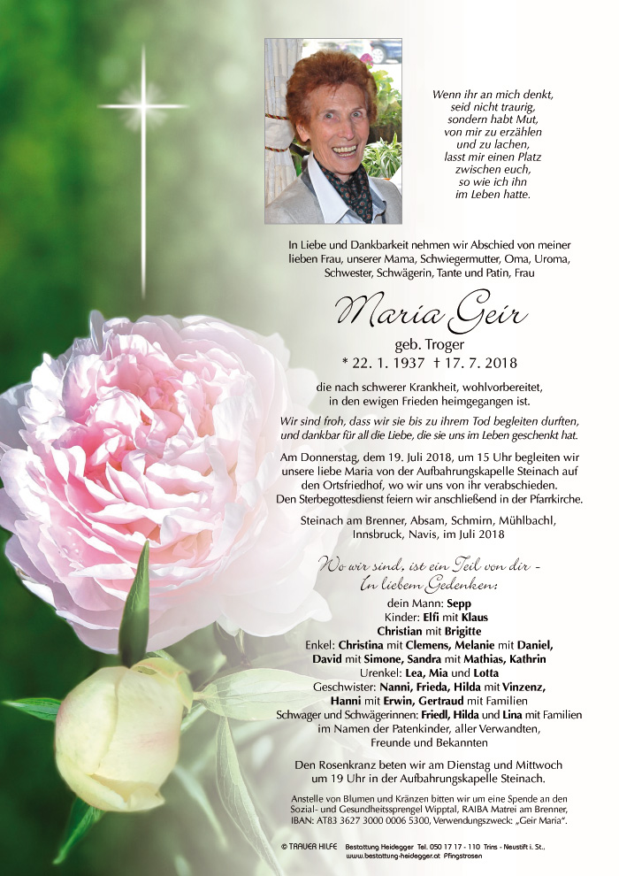 Bestattung wurde durchgeführt von: Karl Neurauter Karl Neurauter Bestattung Heidegger Brennerstraße 69 6150 - Steinach am Brenner Tel.: 05275 5211 zum Bestatter