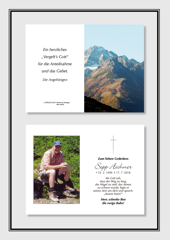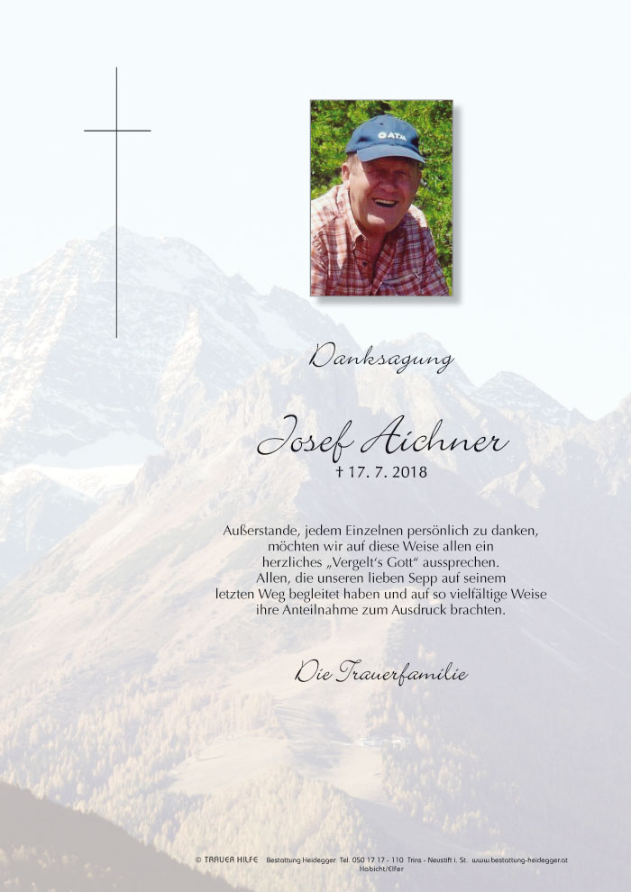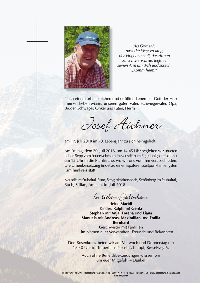 Bestattung wurde durchgeführt von: Karl Neurauter Karl Neurauter Bestattung Heidegger Brennerstraße 69 6150 - Steinach am Brenner Tel.: 05275 5211 zum Bestatter