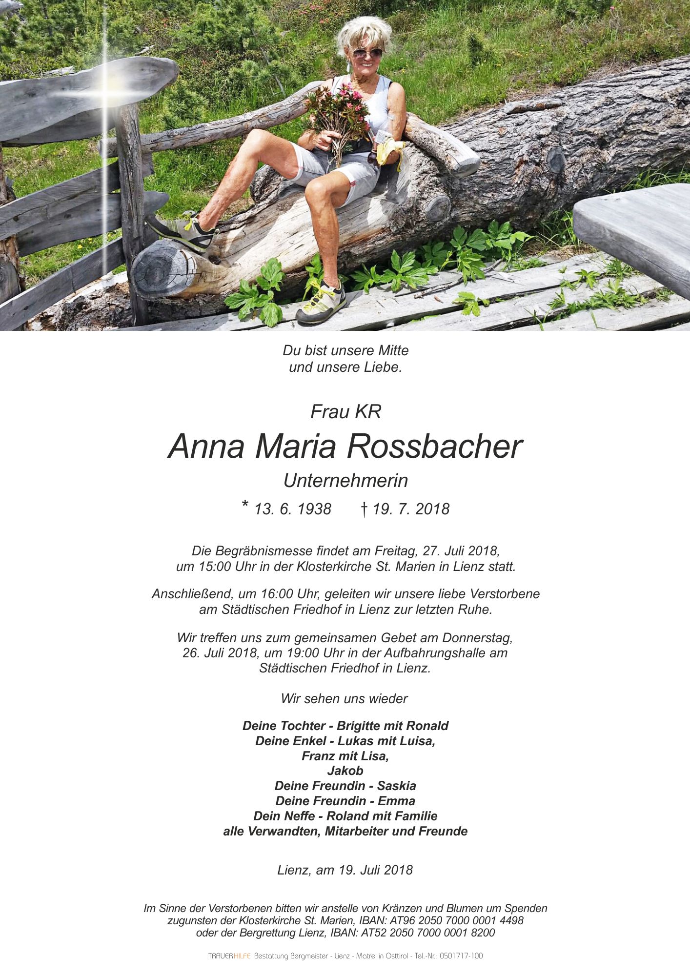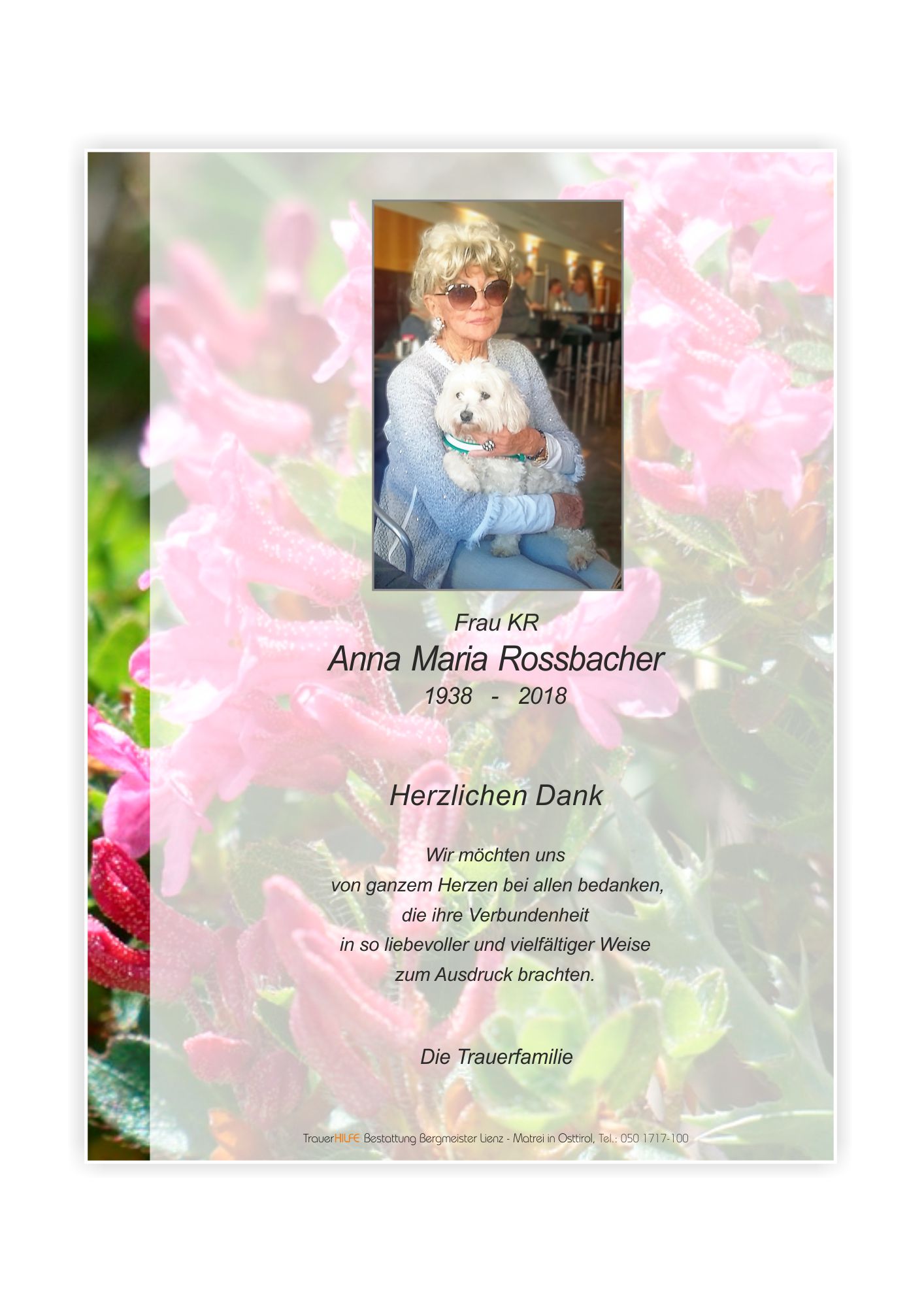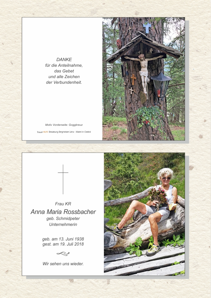 Geschätzte Frau Rossbacher! Die Nachricht über Ihr Ableben hat auch mich sehr traurig gemacht. Über Jahre habe ich mich gefreut, Sie in Begleitung Ihres Hundes bei uns zu begrüßen und ein kleines Schwätzchen zu halten. Ich habe Ihre Liebe zu den Menschen und auch zu den Tieren immer hoch geschätzt.