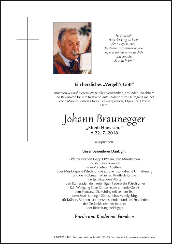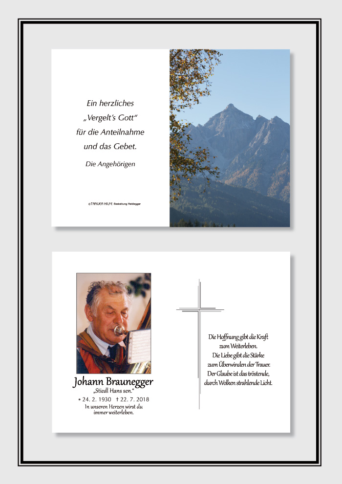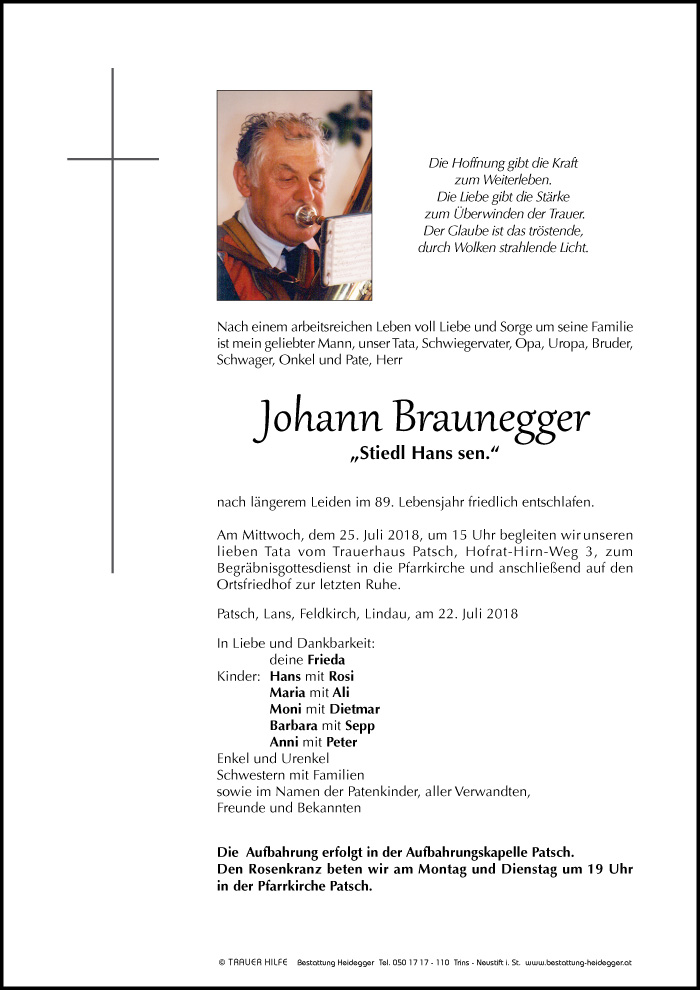 Bestattung wurde durchgeführt von: Karl Neurauter Karl Neurauter Bestattung Heidegger Brennerstraße 69 6150 - Steinach am Brenner Tel.: 05275 5211 zum Bestatter